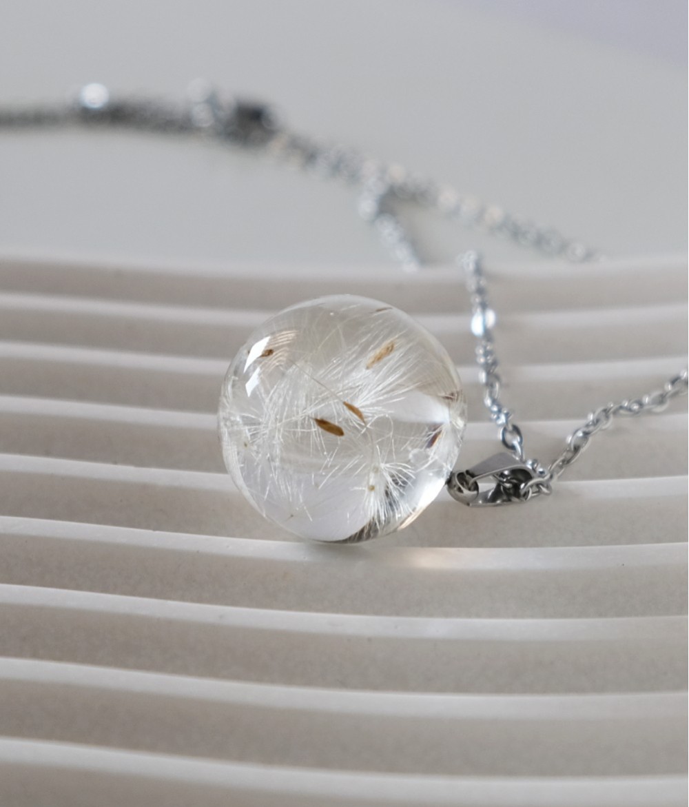 Il ciondolo, di circa 2cm di diametro, è realizzato e lucidato a mano, della collezione marina "Favignana": ingloba elementi naturali come conchiglie, sabbia bianca, muschio e rametti.